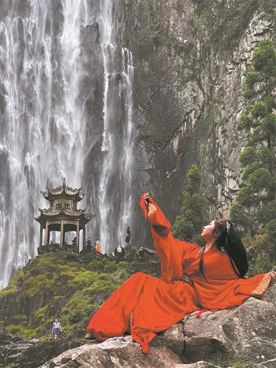 游人身着古装打卡文成百丈漈瀑布。翁卿仑摄