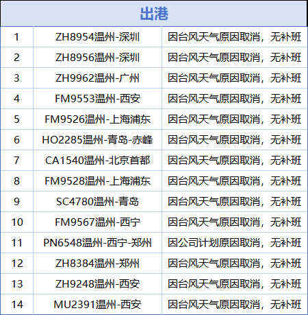 受今年第4号台风“丹娜丝”影响,截至7月8日22:00,7月9日温州机场取消航班预计共21架次,其中进港7架次,出港14架次。具体航班取消情况如下: